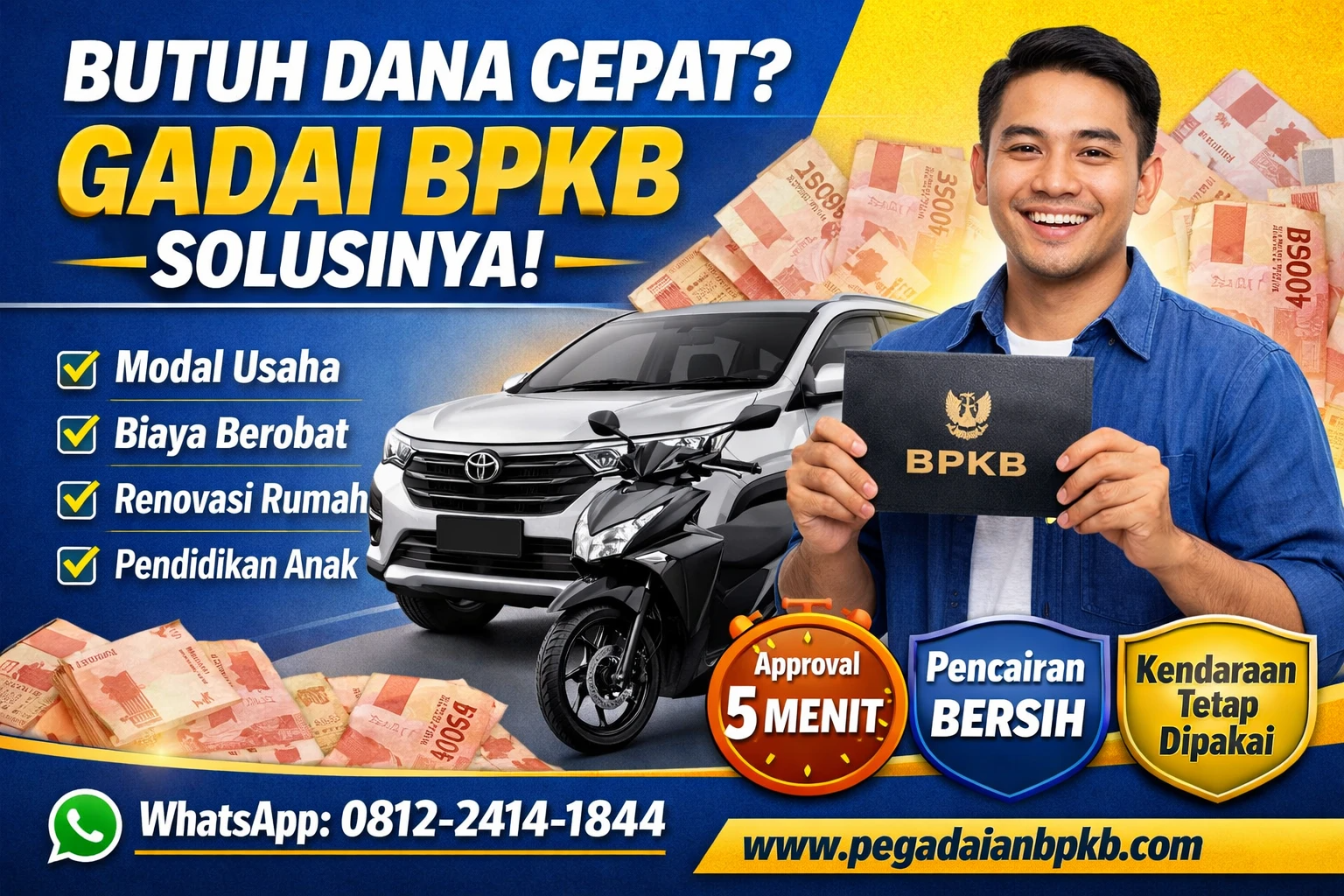 Apakah untuk modal usaha, renovasi rumah, biaya pendidikan, atau kebutuhan mendesak lainnya — gadai BPKB motor dan mobil di PegadaianBPKB.com hadir sebagai solusi yang tidak perlu antri, tidak perlu ke kantor, dan bisa cair hari ini.