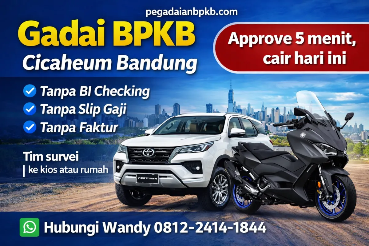 Masalahnya, leasing besar di sekitar Cicaheum rata-rata wajib BI Checking bersih, wajib slip gaji, dan harus datang ke kantor cabang. Ini jelas tidak praktis untuk pedagang yang tidak bisa ninggal kios di jam sibuk. PegadaianBPKB.com melalui Wandy hadir sebagai solusi: tim survei datang ke kios atau rumah Anda, tanpa BI Checking, tanpa slip gaji. Approve 5 menit, dana cair hari ini.