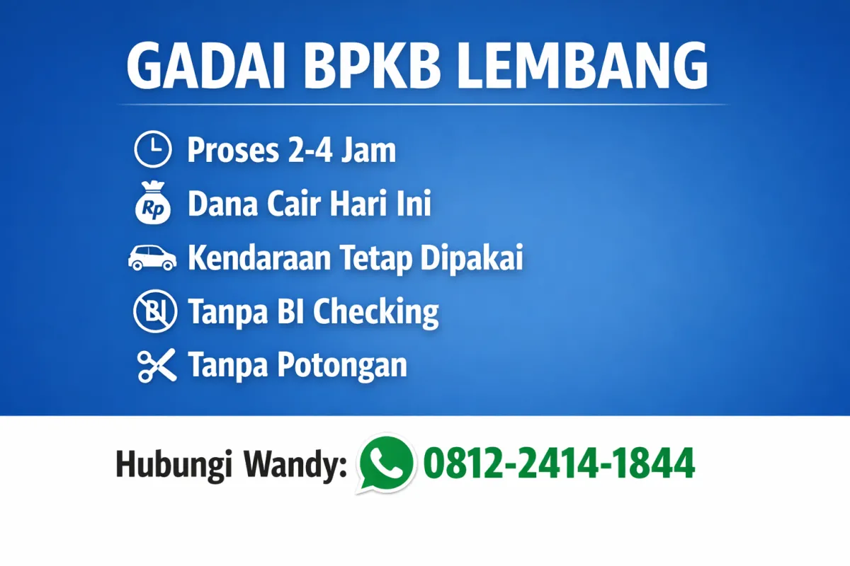 Gadai BPKB Lembang dari PegadaianBPKB.com adalah solusi dana tunai tercepat untuk warga Lembang dan sekitarnya. Kawasan wisata dan permukiman berkembang di Bandung Barat ini punya banyak pelaku usaha — pengusaha agrowisata, pedagang, pemilik villa, petani — yang kadang butuh dana cepat tanpa proses berbelit.
